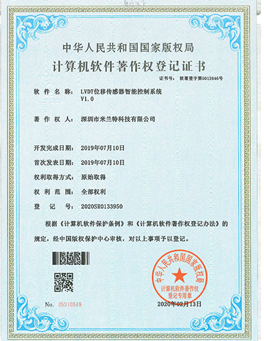 米蘭特LVDT位移傳感器智能控制系統(tǒng)V1.0軟件著作權(quán)登記證書