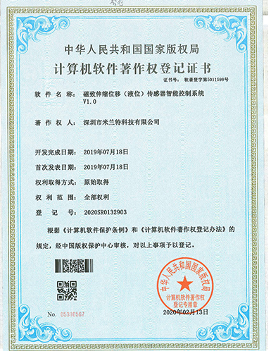 米蘭特磁致伸縮位移傳感器智能控制系統(tǒng)V1.0軟件著作權(quán)登記證書