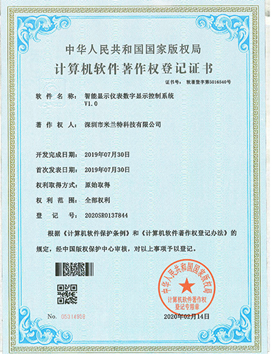 米蘭特智能顯示儀表數(shù)字顯示控制系統(tǒng)V1.0軟件著作權(quán)登記證書
